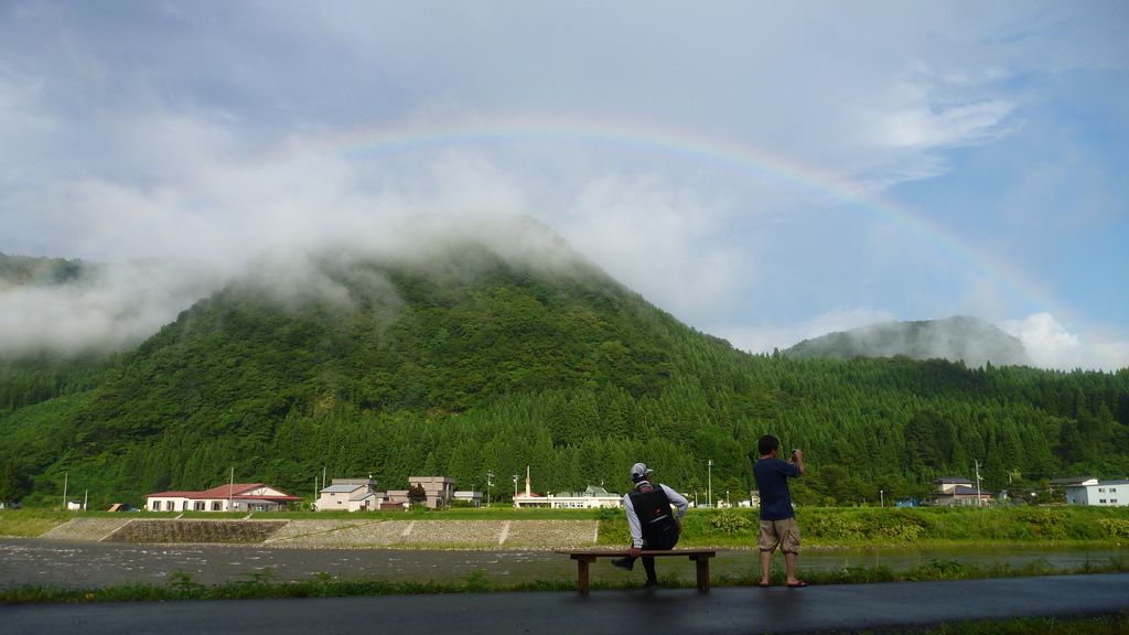 カラリと晴れて、目の前の山に手が届きそうな虹が出た。